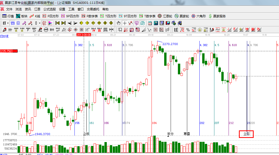 ★依據(jù)贏家江恩系統(tǒng)黃金時間周期線提示:7號、8號為日線時間窗,同時24節(jié)氣立冬是7號;