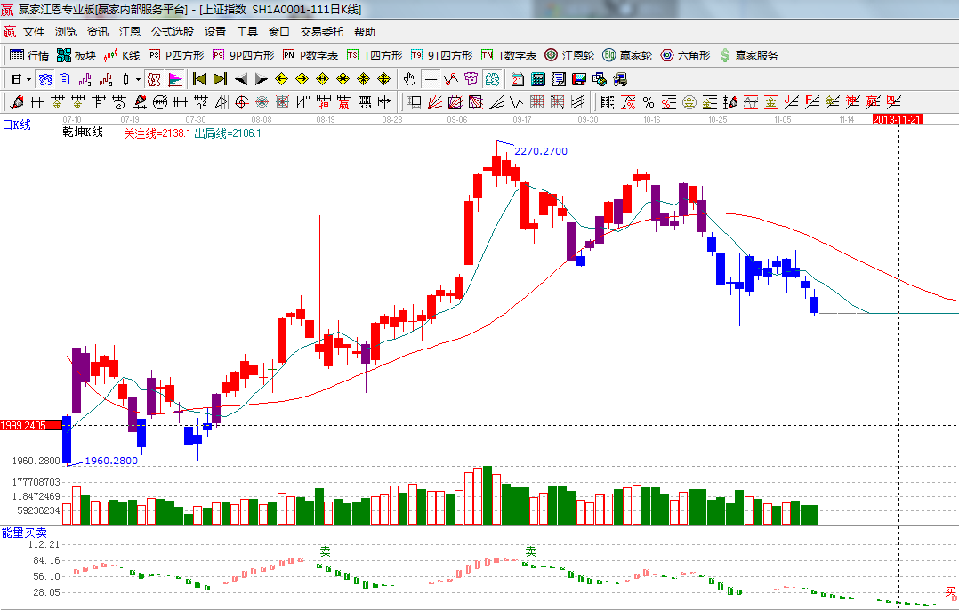 ☆依據(jù)贏家江恩系統(tǒng)乾坤K線提示:藍(lán)色K線為休息區(qū),出局線、關(guān)注線空頭排列;