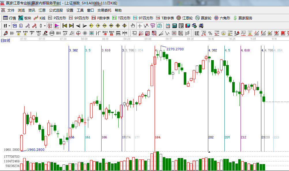 ★依據(jù)贏家江恩系統(tǒng)波段百分比延伸提示:黃金分割價(jià)格圖0.5位置是2090,0.618位置是2035;