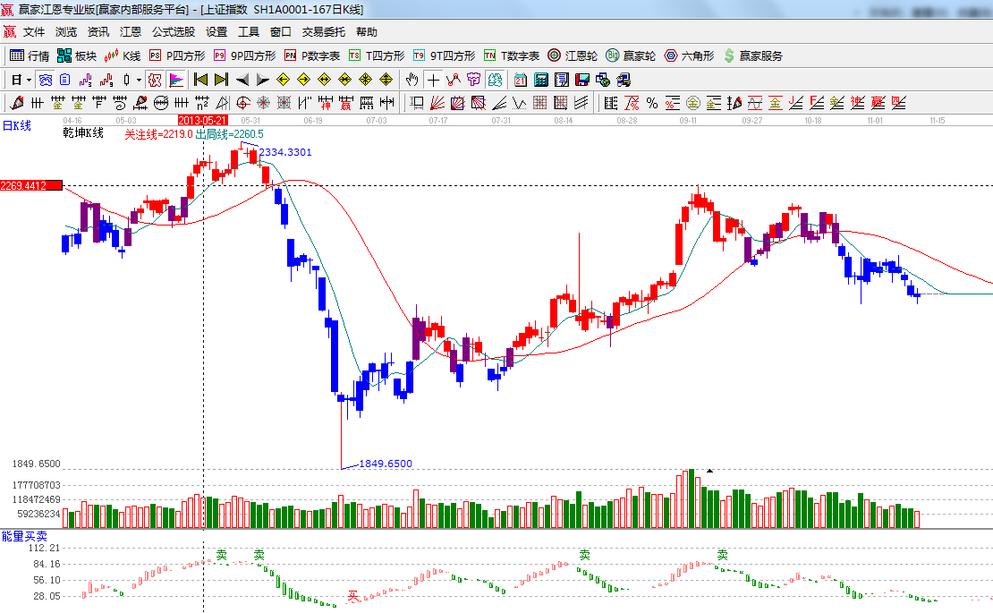 ☆依據贏家江恩系統(tǒng)乾坤K線提示:藍色K線為休息區(qū),出局線、關注線空頭排列;