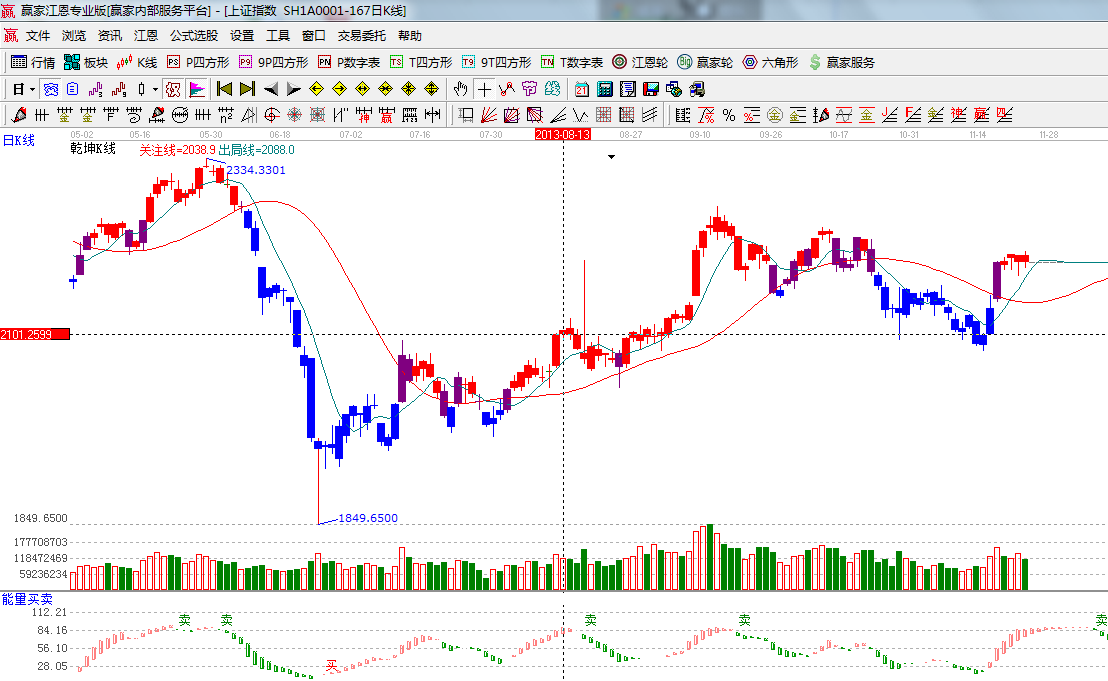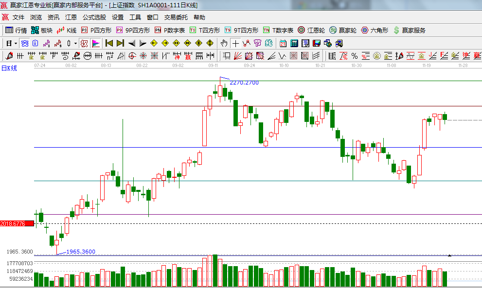 本周初18號(hào)滬指放量中陽(yáng)突破江恩軟件極反通道生命線2170位置,隨后轉(zhuǎn)入橫盤(pán)震蕩格局,市場(chǎng)賺錢(qián)效應(yīng)與活躍度增加成交量顯著放大,市場(chǎng)熱點(diǎn)圍繞改革題材炒作,如二胎開(kāi)放、軍工、天津自貿(mào)區(qū),特別是進(jìn)入年底行情高送轉(zhuǎn)概念股也將成為持續(xù)的熱點(diǎn),滬指趨勢(shì)不破極反通道生命線處于安全操作區(qū)投資者可繼續(xù)這類(lèi)短期調(diào)整后的機(jī)會(huì);技術(shù)方面從K線組合判斷中陽(yáng)橫盤(pán)后遇到費(fèi)氏時(shí)間將出現(xiàn)方向選擇,通常時(shí)間窗為陽(yáng)線后的第3天、5天、8天,重點(diǎn)觀察市場(chǎng)下周初變化,波段思路看好未來(lái)行情,倉(cāng)位上可保持在5成或5成以上,短線、波段結(jié)合操作;