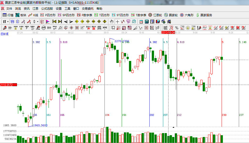 ☆依據(jù)贏家江恩系統(tǒng)波段百分比延伸提示:黃金分割價(jià)格圖0.236位置是2219點(diǎn),0.382位置是2050點(diǎn);