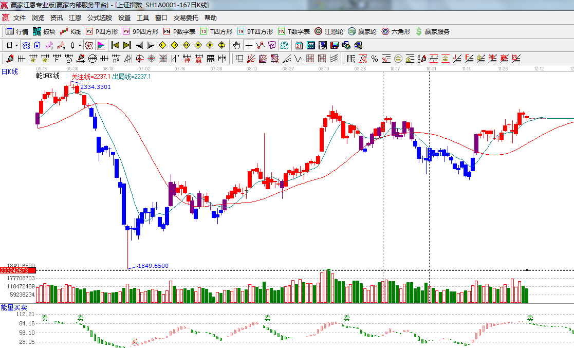 ★依據(jù)贏家江恩系統(tǒng)乾坤K線提示: K線回踩短期出局線,出局線運(yùn)行短線、波段看多,K線在出局線下運(yùn)行則是短線看空波段繼續(xù)看多;