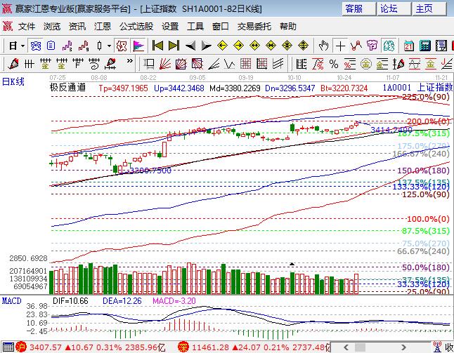 大盤周四高開震蕩上漲放量收盤站上3400點(diǎn)關(guān)口,滬指創(chuàng)反彈以來新高,深市幾大指數(shù)走勢(shì)相對(duì)較弱,僅創(chuàng)業(yè)板沒有創(chuàng)近期新高。板塊方面,釀酒、保險(xiǎn)領(lǐng)漲,鋼鐵、有色、煤炭等藍(lán)籌股漲幅靠前,銀行板塊領(lǐng)跌;題材方面,高鐵概念領(lǐng)漲題材,5G、芯片、特斯拉、次新和上海自由港局部表現(xiàn),開板新股、環(huán)保、醫(yī)療和房屋租賃等領(lǐng)跌,個(gè)股漲多跌少,成交量配合上漲放量。技術(shù)方面,短周期15、30分鐘K線推進(jìn)到極反通道外軌線處受阻回落,60、120分鐘及日線外軌線共振區(qū)在3440區(qū)域,待15、30短期修復(fù)后還將帶動(dòng)大周期上行,昨日早盤中已提到日線領(lǐng)度成為上行中的阻力,距離外軌線共振區(qū)空間也有限,大概率24號(hào)早盤分析提到的加倉(cāng)籌碼,會(huì)在11月7號(hào)外軌線附近選擇高拋,此觀點(diǎn)是對(duì)市場(chǎng)預(yù)判,執(zhí)行策略會(huì)跟隨市場(chǎng)走勢(shì)做調(diào)整,波段倉(cāng)5成,短線倉(cāng)3成,3388、3397為日內(nèi)支撐,3420、3427為日內(nèi)壓力。僅供參考,不構(gòu)成任何投資建議。