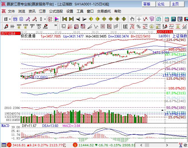 上周五大盤低開震蕩延續(xù)小漲,同時再創(chuàng)新高,深成指幾大指數(shù)處于綠盤小跌,其中創(chuàng)業(yè)板跌幅達(dá)0.76%。板塊方面,釀酒、保險、銀行板塊大漲,家電、食品和醫(yī)藥消費(fèi)板塊也有表現(xiàn),有色、鋼鐵、煤炭和券商領(lǐng)跌;題材方面,黃金、稀土永磁、高鐵、石墨烯、人工智能和房屋租賃概念領(lǐng)跌,個股下跌居多,成交量較前日縮量,但整體為逐漸放量。技術(shù)方面,滬指日線沖周短期阻力帶,江恩百分比零度與極反通道外軌線構(gòu)成阻力帶是3420-3444點(diǎn)。短期走勢上周五盤中以在群中詳細(xì)進(jìn)行描述,15分鐘不破生命線震蕩修復(fù)指標(biāo),帶更大的周期60分鐘受外軌線阻力時則將于日線共振,操作上此位置不在具備大幅加倉條件,前期布局的5成波段倉均有不錯的收益,短期做好波段股差主,操作頻率以盤中表現(xiàn)強(qiáng)弱決定,3404、3397為日內(nèi)支撐,3420、3429為日內(nèi)壓力。僅供參考,不構(gòu)成任何投資建議。
