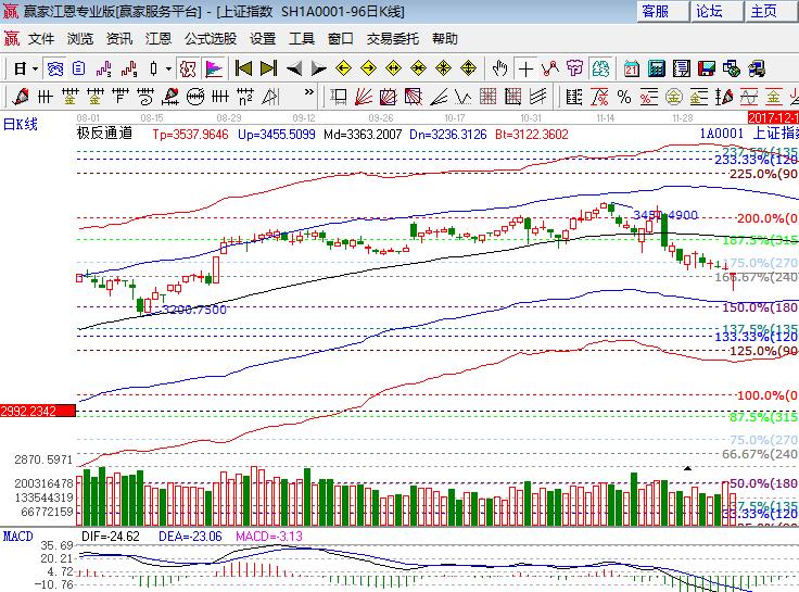 周三滬指跳空低開深V收長下影線,早盤及午盤開盤權(quán)重藍籌下砸,深成指幾大指數(shù)均上漲,創(chuàng)業(yè)板大漲近1.5%,滬指尾盤回升受益于深市帶動,短期風格轉(zhuǎn)向題材。板塊方面,僅券商勉強收紅,保險、鋼鐵、家電、石油和銀行領(lǐng)跌,釀酒、煤炭、有色走勢相對較弱;題材方面,芯片、次新、人工智能、5G和軍工引領(lǐng)題材股行情,個股上漲居多,成交量同前日相比出現(xiàn)萎縮。技術(shù)方面,滬指短周期60分鐘下跌至下降趨勢線后展開反抽,15、30分鐘K線靠近生命線,今日盤中反抽時注意此線的阻力,趨勢判斷遵循上漲看支撐,下跌看阻力原則,日線已向極反通道弱勢外軌線靠攏,11月下旬我們所預(yù)期的均線系統(tǒng)、極反通道各周期跟隨的動作還在持續(xù)中,自3450調(diào)整以來的第一腳落地,反復(fù)震蕩動作還將延續(xù),極少一部分個股已具備操作,但甄選有難度,隨著時間推移等待日、周時間窗口的到來做高概率操作。波段倉保持在4成(中長線倉位),短線休息,3280、3275為日內(nèi)支撐,3308、3320為日內(nèi)壓力。僅供參考,不構(gòu)成任何投資建議。