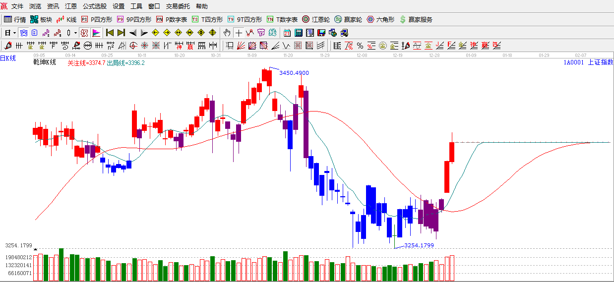 ★依據(jù)贏家江恩理論系統(tǒng)乾坤K線提示:紅色關(guān)注線之上,出現(xiàn)紅色k線,依據(jù)規(guī)則,趨勢轉(zhuǎn)多。