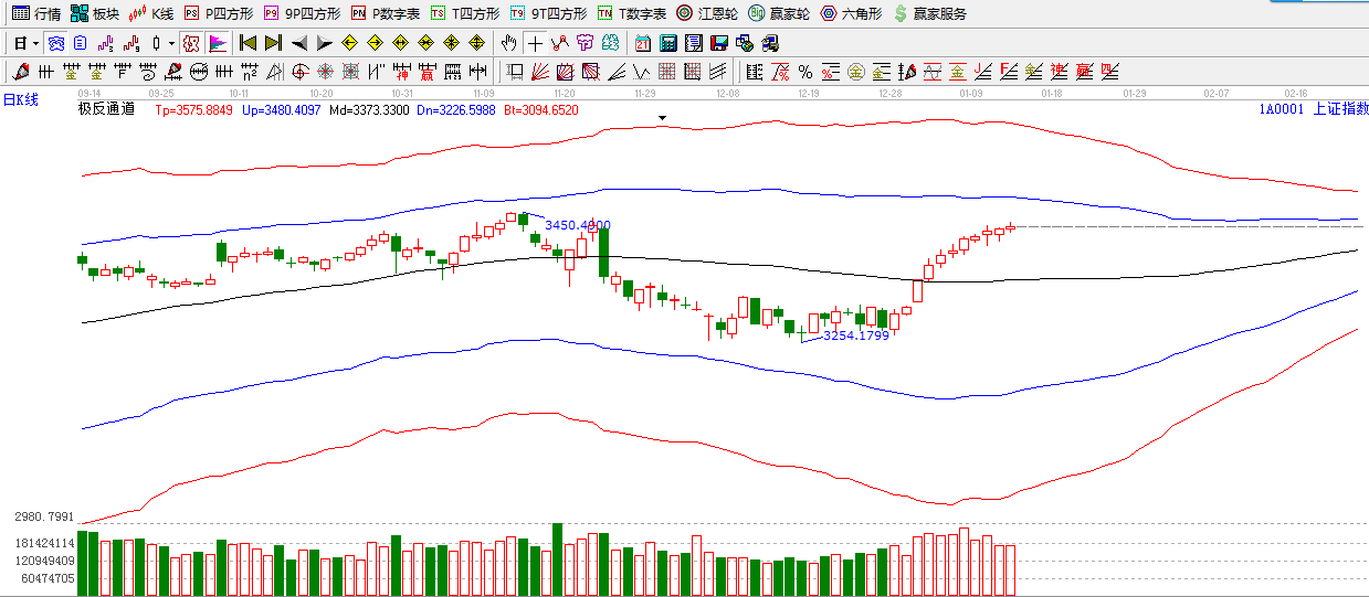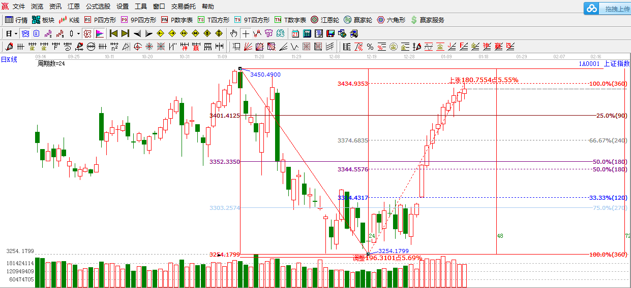 江恩看盤綜述:依據(jù)贏家江恩技術(shù)工具分析得出:周五,滬指再次日線新高,量能持續(xù)縮小,自10日窗口之后量能持續(xù)縮小,是制約指數(shù)空間的主要因素。指數(shù)整理甚至回調(diào)的需求逐步提升。短期還是建議逢高逐步減倉,謹防出現(xiàn)急速的下跌。支撐依舊關(guān)注3400點,3380點附近,1月時10日之后,下一個窗口是1月22日附近。操作上,繼續(xù)關(guān)注成長性良好的超跌股以及個股的年報行情。