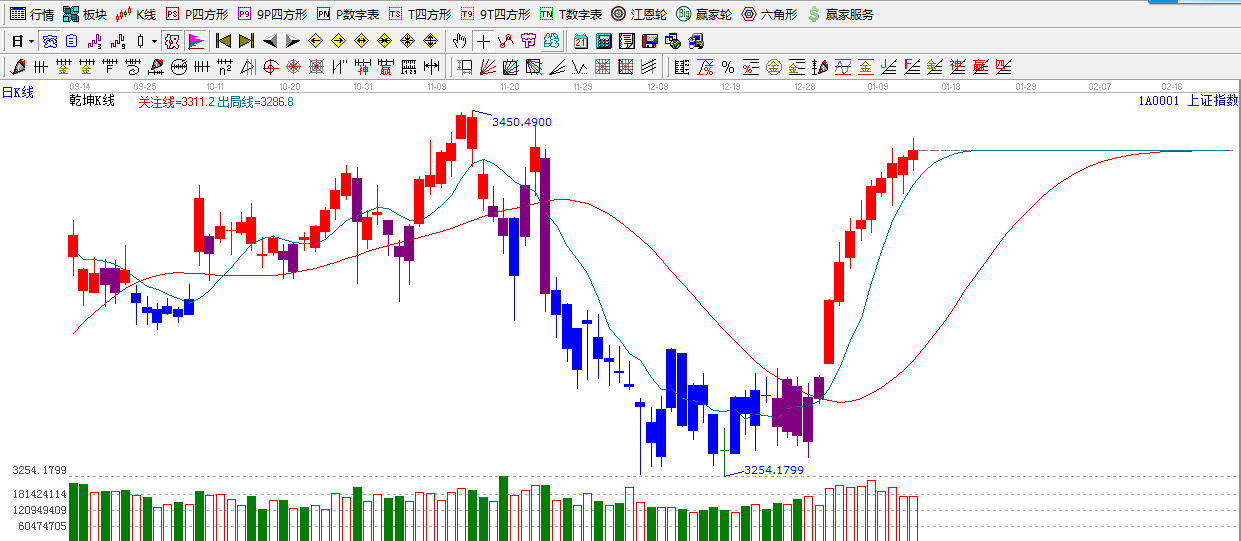 ★依據(jù)贏家江恩理論系統(tǒng)乾坤K線提示:紅色關(guān)注線之上,紅色可操作區(qū)域,趨勢多頭。