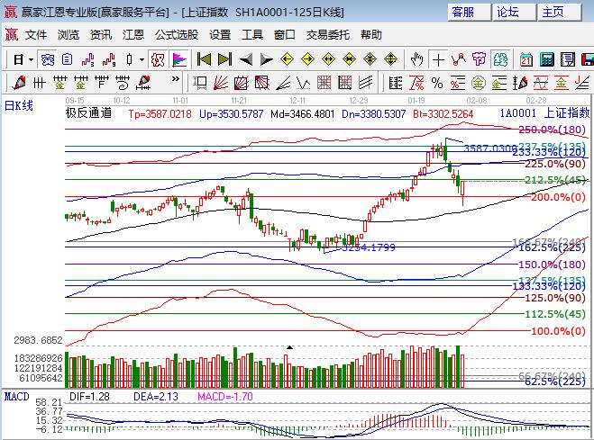 上周五大盤大幅低開下探一度跌破3400點后展開回抽,尾盤在石油帶動下翻紅,深市幾大指數(shù)全線小漲。板塊方面,周期股煤炭、鋼鐵、有色、石油、建材等板塊領(lǐng)漲,環(huán)保、釀酒等領(lǐng)跌,題材無明顯表現(xiàn),次新、海南本地、高送轉(zhuǎn)和ST等領(lǐng)跌,個股下跌居多,跌停板多達60家,成交量較前日萎縮。技術(shù)方面,滬指日線最低基本探至極反通道生命線位置,K線懸空可上可下位置,江恩百分比2倍零度位置3420點與生命線構(gòu)造支撐區(qū)間,45度(3470點)與外軌線位置(3510點)構(gòu)成阻力區(qū)間,預(yù)計節(jié)前滬指將在此區(qū)間內(nèi)震蕩;創(chuàng)業(yè)板下挫再度試探趨勢線位置后反抽,前期低點1641點附近會有反復(fù);上證50主線品種強勢,此指數(shù)調(diào)整空間有限。市場正在構(gòu)造中期箱體,操作上不追高,從銀行、地產(chǎn)、化工、周期股輪換中尋找低吸機會。倉位中長線4成倉持股不動,3420、3430為日內(nèi)支撐,3470、3480為日內(nèi)壓力。僅供參考,不構(gòu)成任何投資建議。