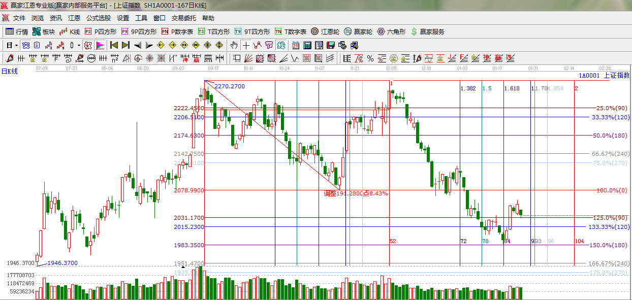 綜上所述:依據(jù)贏家江恩技術(shù)工具分析得出:滬深兩市弱勢(shì)走低,回探江恩90度支撐2031點(diǎn),關(guān)注此位置得失,此位置不破。后市有望在短暫調(diào)整后繼續(xù)沖高,本周時(shí)間之窗12月30(黃金分割0.764)操作方面,結(jié)合工具規(guī)則,倉(cāng)位保持5成,星級(jí)風(fēng)險(xiǎn)提示,謹(jǐn)慎看多。