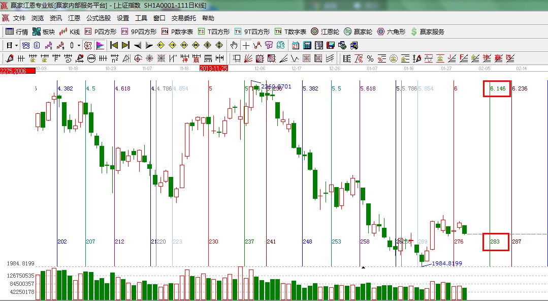 ★依據(jù)贏家江恩系統(tǒng)黃金時間周期線提示:馬年第一個時間窗為黃金分割第六個循環(huán)的6.146位置是下周三12號;