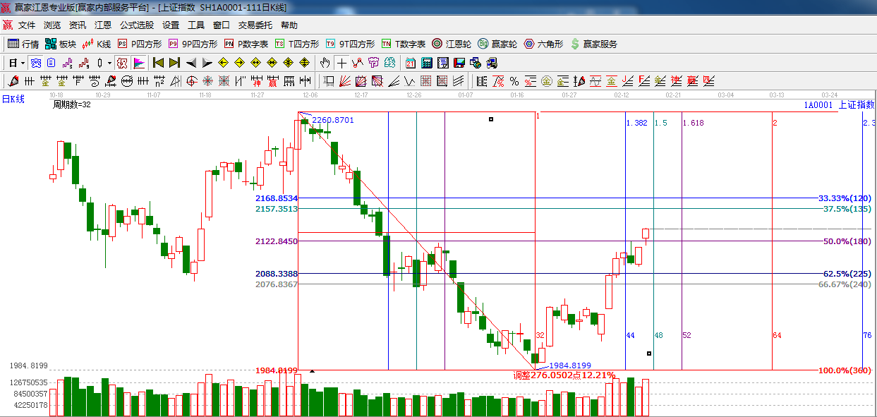 ☆依據(jù)贏家江恩系統(tǒng)黃金時間周期線提示:江恩時間窗口是2月18日,2月24日(黃金時間1.5,1.618的時間窗口)