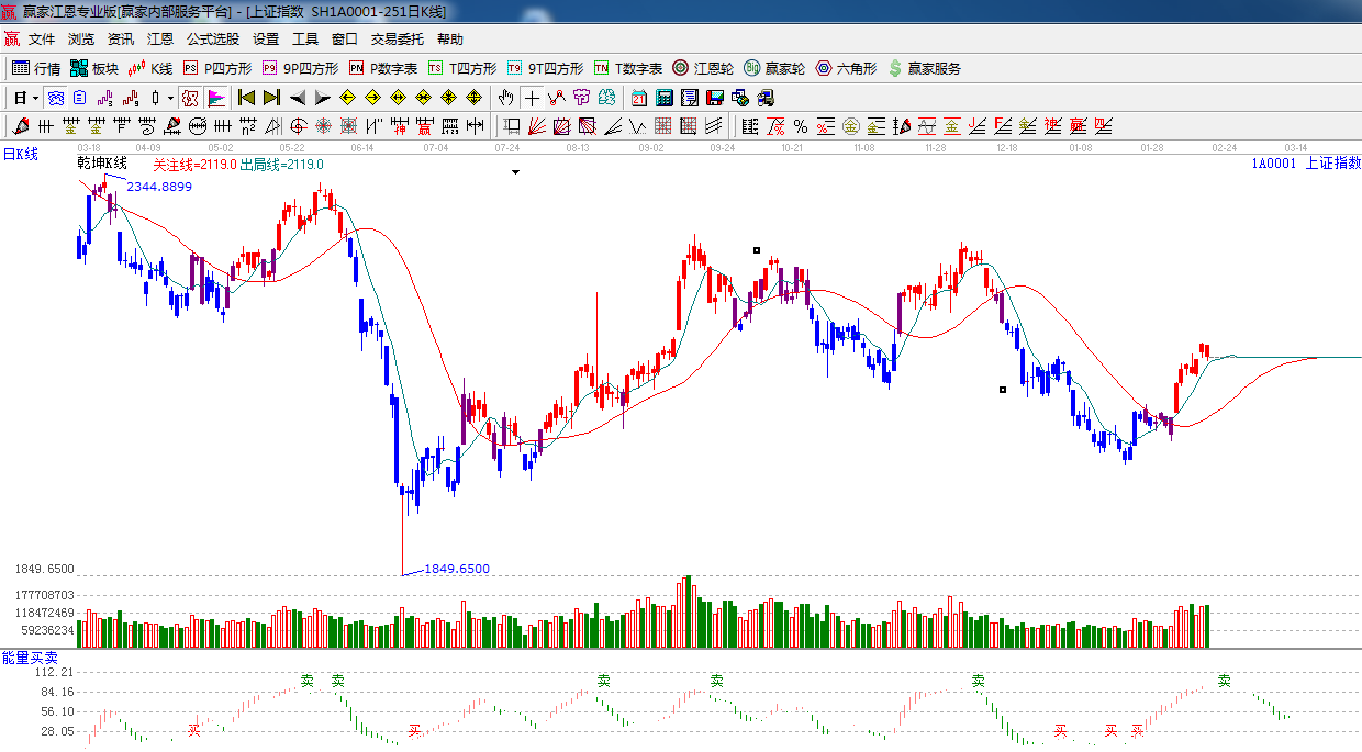 ★依據(jù)贏家江恩系統(tǒng)乾坤K線提示:紅色可操作區(qū)域,出局線上方,看多。