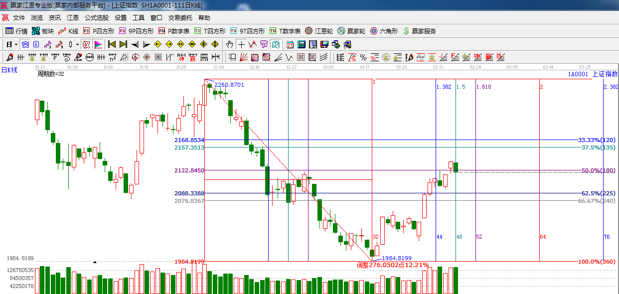 ☆依據(jù)贏家江恩系統(tǒng)黃金時間周期線提示:2月18日時間窗口,放量中陰收盤,短期注意風(fēng)險,下一需要留意的時間窗2月24日(黃金時間1.618的時間窗口)