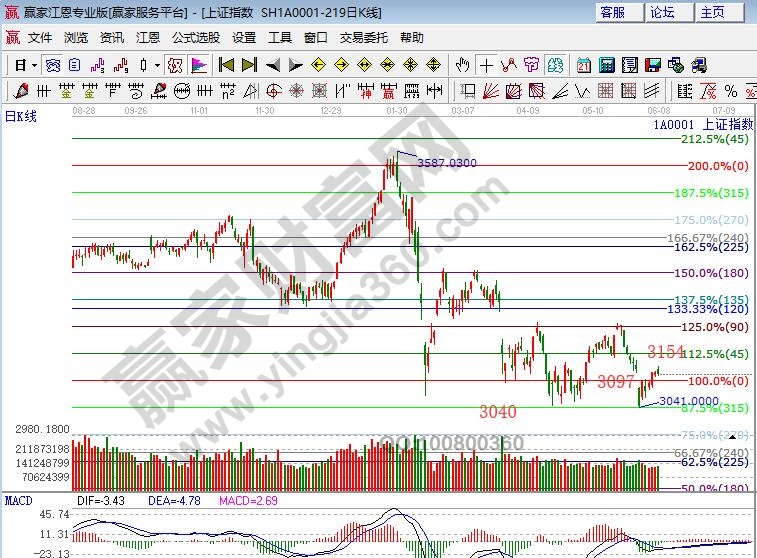 ★依據(jù)贏家江恩理論系統(tǒng)波段百分比延伸線提示:日線在零度位3097點上震蕩,此線不破上方阻力是45度3154點。