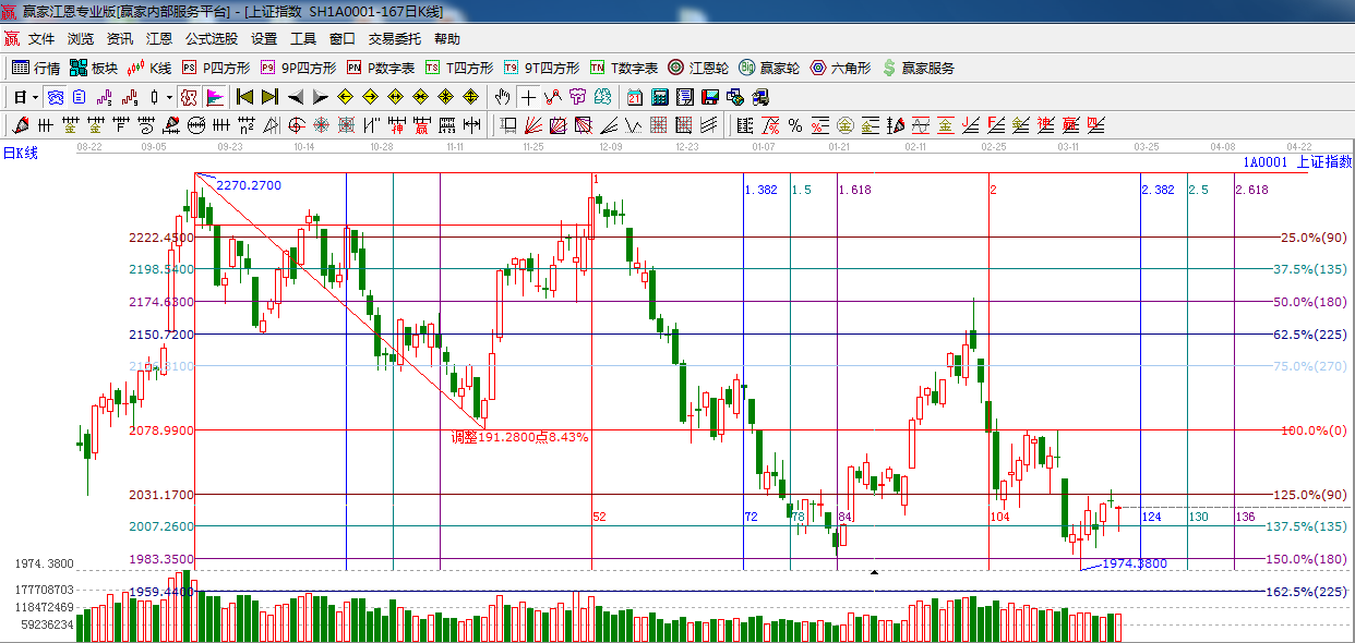 綜上所述:依據(jù)贏家江恩技術(shù)工具分析得出:指數(shù)早盤如期回落,回探2000后震蕩回升,收T字線,目前市場(chǎng)整體形勢(shì)依然偏弱,明日關(guān)注江恩90度阻力2031點(diǎn),支撐135度2007點(diǎn)附近,短期市場(chǎng)將延續(xù)弱勢(shì)震蕩為主,下一重要時(shí)間窗口位24號(hào),操作上,保持一定謹(jǐn)慎態(tài)度,倉(cāng)位控制3成。星級(jí)風(fēng)險(xiǎn)提示,看空