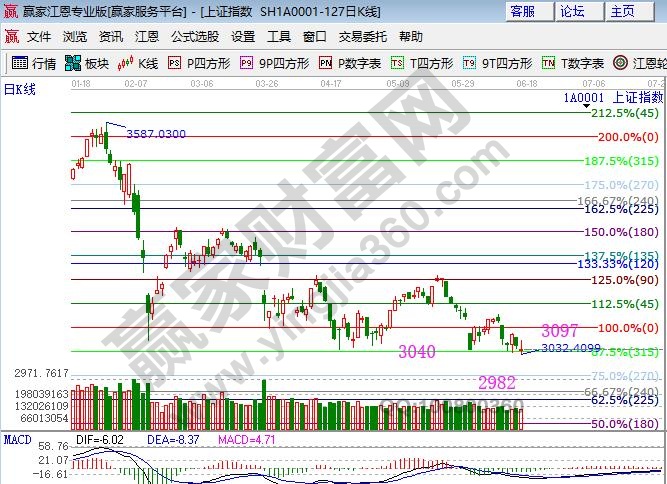★依據(jù)贏家江恩理論系統(tǒng)波段百分比延伸線提示:日線再探315度3040位置,明日觀察此線支撐,此線不破上方阻力是零度3097點(diǎn),失守則下方是2982點(diǎn)。