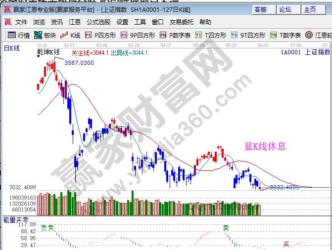 ☆依據(jù)贏家江恩理論系統(tǒng)乾坤K線提示:藍(lán)色K線代表波段休息,收盤價在短期出局線下運(yùn)行,短線、波段看空。