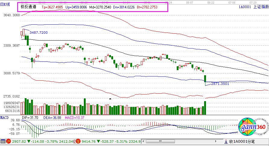 滬指跌3.78%,報(bào)收2907點(diǎn);深成指跌5.31%,報(bào)收9414點(diǎn);創(chuàng)業(yè)板跌5.76%,報(bào)收1547點(diǎn)。盤面上看,鈦白粉、通信技術(shù)、造紙、特鋼、自由貿(mào)易港、知識產(chǎn)權(quán)保護(hù)、CDR概念等板塊跌幅居前。全天,滬股通凈流出19億元,深股通凈流出900萬元。相應(yīng)的極反通道指標(biāo)的支撐壓力提示,如下圖所示: