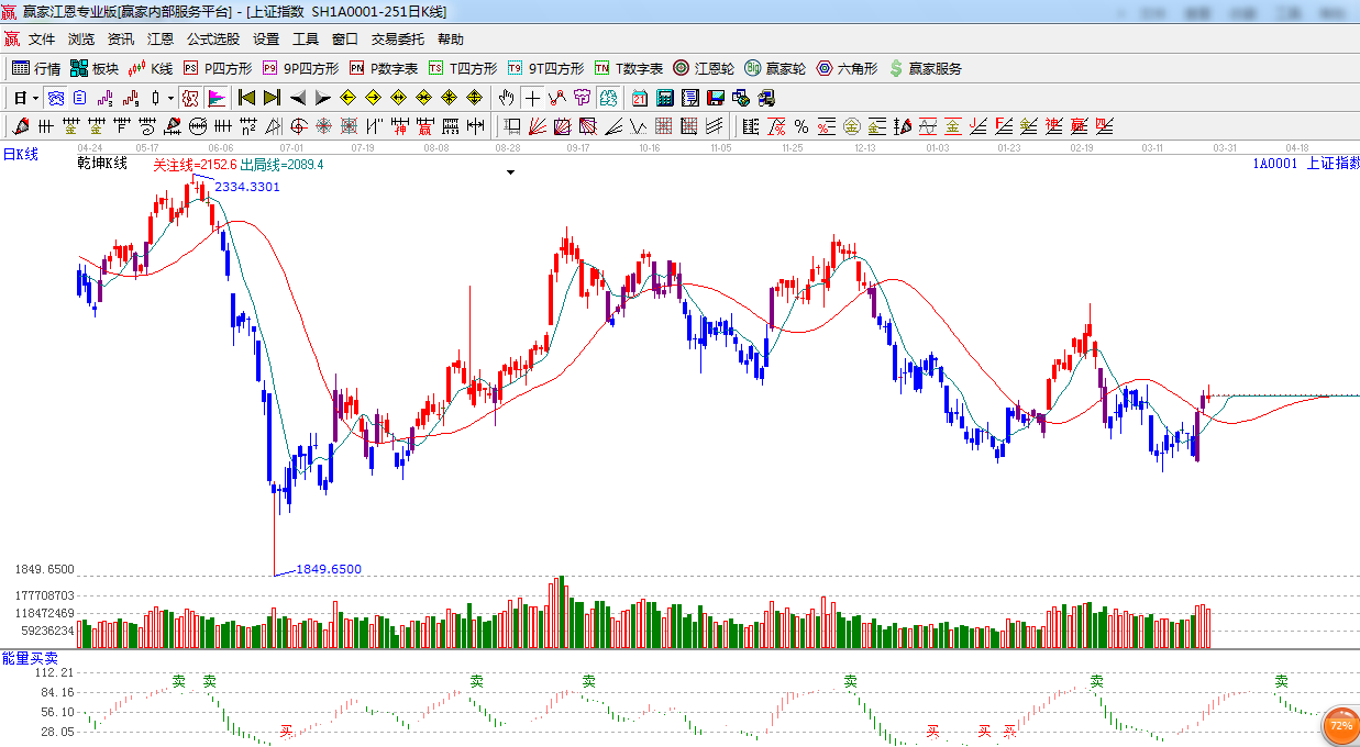★依據(jù)贏家江恩系統(tǒng)乾坤K線提示:,放量突破關(guān)注線,k線由紫色變?yōu)榧t色k線,看多。