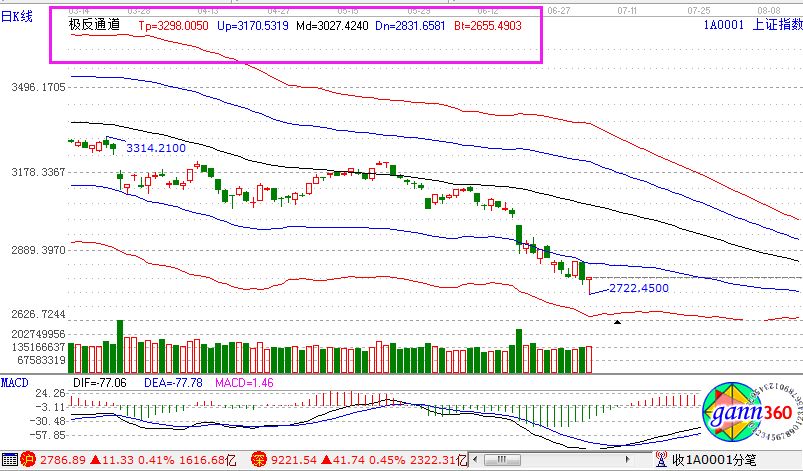 滬指漲0.41%,報(bào)2786.89點(diǎn);深成指漲0.45%,報(bào)9221.54點(diǎn);創(chuàng)業(yè)板指漲1.16%,報(bào)1607.12點(diǎn)。從盤面上看,軍工、國(guó)產(chǎn)軟件、集成電路、芯片、半導(dǎo)體、5G等板塊漲幅居前;白酒、機(jī)場(chǎng)航運(yùn)、超級(jí)品牌、飲料制造、汽車整車、黃金、豬肉等板塊跌幅居前。滬股通凈流入17億,深股通凈流出12億。相應(yīng)的極反通道指標(biāo)的支撐壓力提示,如下圖所示: