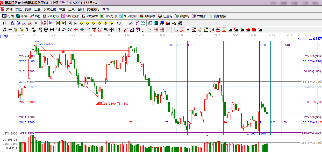 綜上所述:依據(jù)贏家江恩技術(shù)工具分析得出:目前整體趨勢處于生命線之下,指數(shù)在江恩90度支撐附近止跌,小陰星報收,此位置不破,將有小幅反抽,后期能否放量突破生命線是反彈的關(guān)鍵。本周時間窗4月1日。操作方面,倉位控制在3-5成,謹(jǐn)慎為主,星級風(fēng)險提示,謹(jǐn)慎做多。