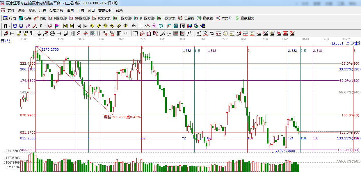 綜上所述:依據(jù)贏家江恩技術工具分析得出:周一指數(shù)圍繞江恩90度位置弱勢整理,量能較前一交易日明顯萎縮,大盤連收4陰,預計短期市場仍將以弱勢整理為主,明日是日線級別的時間窗口,留意后期權重的表現(xiàn),操作上,降低倉位為主,謹慎為主。星級風險提示,謹慎看多。