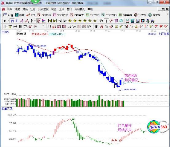 ☆依據(jù)贏家江恩理論系統(tǒng)乾坤K線提示:藍(lán)色K線,波段趨勢(shì)仍為空。
