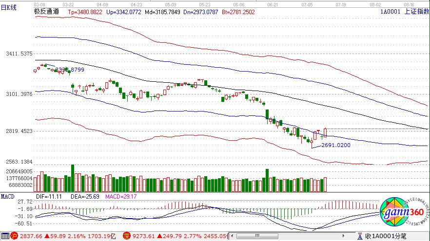滬指漲2.16%,報(bào)2837點(diǎn);深成指漲2.77%,報(bào)9273點(diǎn);創(chuàng)業(yè)板指漲3.30%,報(bào)1614點(diǎn)。盤面上看,5G、富士康概念、半導(dǎo)體、量子通信、集成電路、芯片等板塊漲幅居前。滬股通凈流入17億,深股通凈流出2.7億。相應(yīng)的極反通道指標(biāo)的支撐壓力提示,如下圖所示: