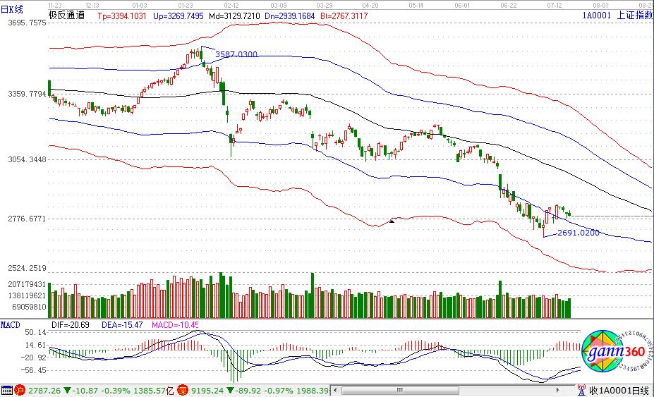 滬指跌0.39%,報收2787點(diǎn);深成指跌0.97%,報收9195點(diǎn);創(chuàng)業(yè)板跌0.85%,報收1607點(diǎn)。從板塊漲幅上看,啤酒、旅游、紡織、電力改革、在線旅游、半導(dǎo)體、PCB概念等漲幅居前;通信設(shè)備、鈦白粉、高送轉(zhuǎn)、無線充電、芯片、海南、知識產(chǎn)權(quán)保護(hù)等板塊跌幅居前。滬股通凈流入1.2億,深股通凈流出1億。相應(yīng)的極反通道指標(biāo)的支撐壓力提示,如下圖所示: