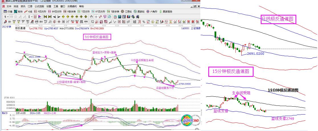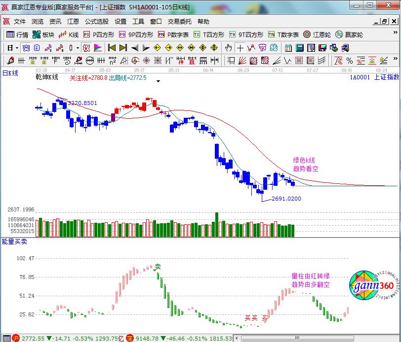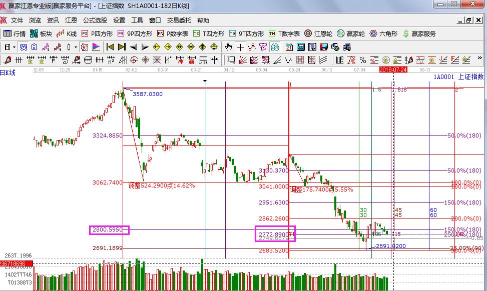江恩看盤綜述:通過贏家江恩系統(tǒng)趨勢(shì)、時(shí)間、價(jià)格工具綜合評(píng)判市場(chǎng)一星看多(五星評(píng)級(jí)標(biāo)準(zhǔn))。滬指日線依托極反通道藍(lán)線下軌線震蕩,7月6號(hào)最低點(diǎn)2691點(diǎn)對(duì)應(yīng)的是月線藍(lán)色下軌線,周線藍(lán)色下軌線是2640附近,周、月線的下軌線走平,在一定程度上限制了下行的空間;短周期15、30、60分鐘均處于生命線下弱勢(shì)通道,單從K線位置而言,懸空可上可下狀態(tài),20號(hào)早盤11點(diǎn)是日內(nèi)時(shí)間窗,15分鐘生命線是2787點(diǎn),對(duì)應(yīng)藍(lán)色下軌線中2750附近,明日觀察時(shí)間窗與價(jià)格的有關(guān)系,遵循線上支撐線下阻力原則。