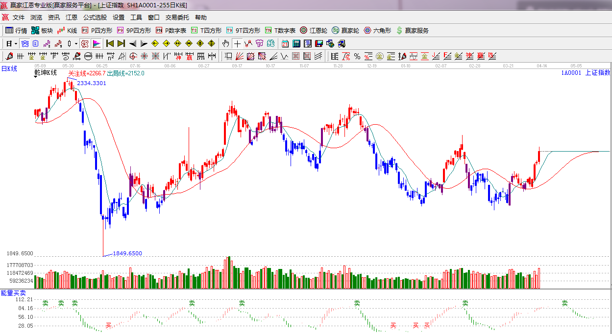 ★依據(jù)贏家江恩系統(tǒng)乾坤K線提示: 紅色可操作區(qū)域,出局線之上,短期看多。
