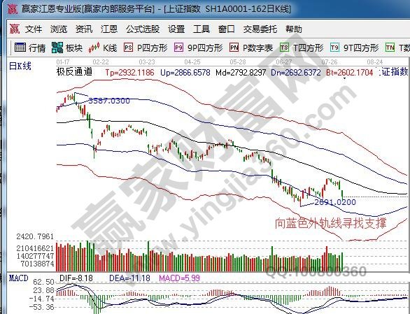☆依據(jù)贏家江恩理論系統(tǒng)極反通道提示:滬指暴跌中短周期15、30、60分鐘極反通道于午盤出現(xiàn)時價共振,跌幅收窄,短期反攻看5分鐘生命線2772及外軌線2790附近,日線按規(guī)則向藍色下軌線尋找支撐。