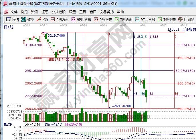 江恩看盤綜述:通過江恩理論系統(tǒng)趨勢、時間、價格工具綜合評判市場一星看多(五星評級標準)。大盤日線受生命線反壓下跌向藍色下軌線尋找支撐,短周期15、30、60分鐘時價共振是下跌途中的暫緩信號;空間上,江恩百分比延伸線顯示,連續(xù)兩日市場擊破零度、180度對應(yīng)的2862點、2772點,2772點反復(fù)不能收復(fù)則直逼新低; 時間上,日線時間點是明天及下周一,周線時間窗是8月16,大盤月線極反通道藍色下軌線是2680附近,等待時間窗口是否與價格形成共振,在此期間多看少動,弱勢行情下本金安全是第一位。