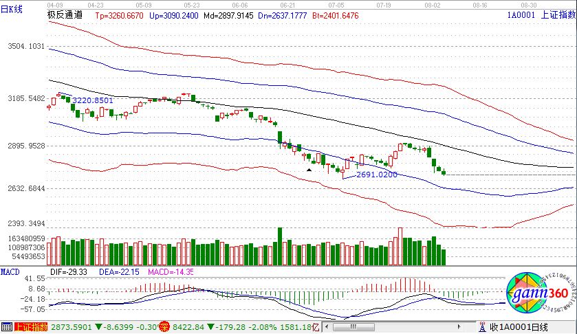 滬指跌1.29%,報2705點;深成指跌2.08%,報8422點;創(chuàng)業(yè)板指跌2.75%,報1440點。盤面上看,西安自貿(mào)區(qū)、銀行、鈦白粉等少數(shù)板塊上漲;草甘膦、禽流感、高送轉(zhuǎn)、自由貿(mào)易港、豬肉、次新股、醫(yī)藥電商等板塊跌幅居前。滬股通凈流入15億,深股通凈流入16億。相應(yīng)的極反通道指標(biāo)的支撐壓力提示,如下圖所示:
