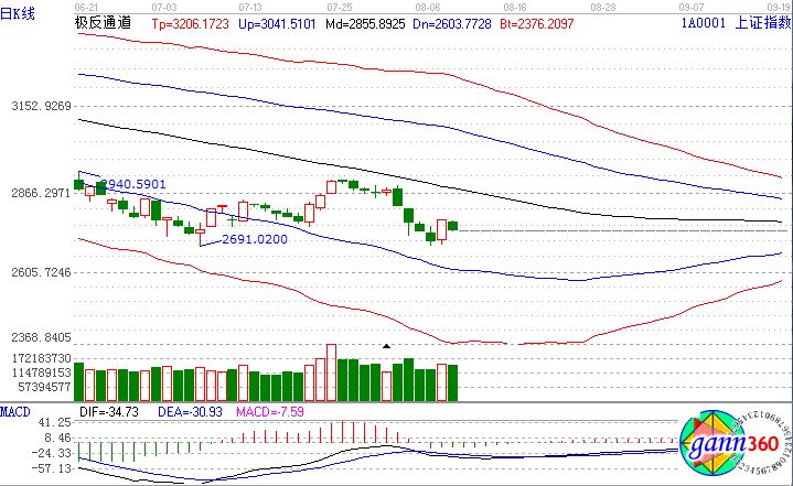 截止收盤,滬指跌1.27%,報2744點;深成指跌2.02%,報8499點;創(chuàng)業(yè)板指跌2.14%,報1447點。盤面上看,水泥、鋼鐵、石油采掘、農(nóng)業(yè)、新疆等板塊上漲;集成電路、次新股、芯片、細胞免疫治療、食品安全等板塊跌幅居前。滬股通凈流入9.5億,深股通凈流入8億。相應的極反通道指標的支撐壓力提示,如下圖所示: