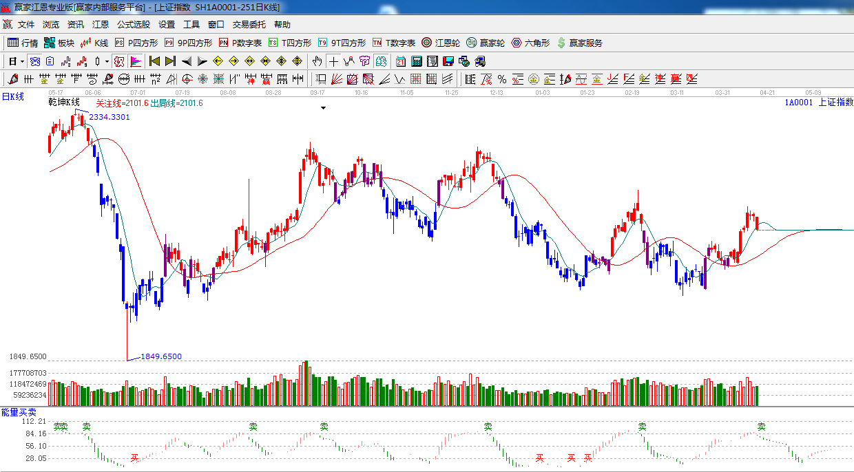 ☆依據(jù)贏家江恩系統(tǒng)能量買賣提示:處于紅色柱子轉(zhuǎn)入綠色柱子的臨界點(diǎn),并出現(xiàn)“賣”字信號(hào),短線 看空。