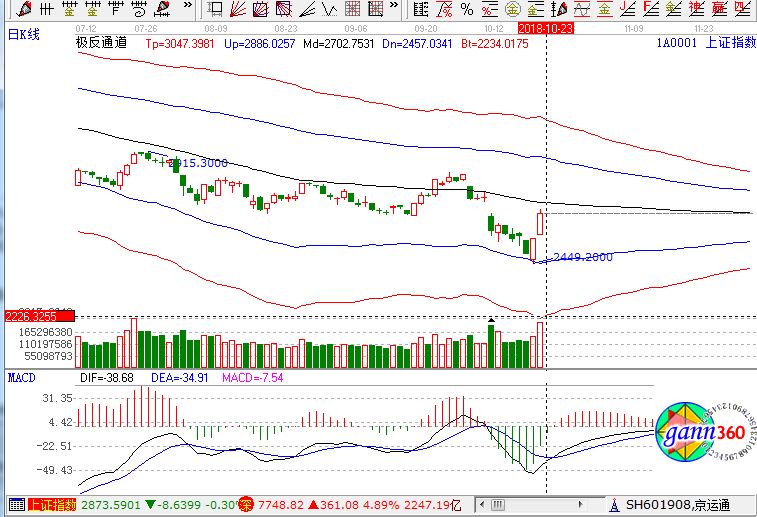 受周末利好消息刺激,A股今日全線(xiàn)走強(qiáng),滬指放量大漲4%,再現(xiàn)百點(diǎn)長(zhǎng)陽(yáng),一舉站上10日線(xiàn),近200只個(gè)股漲停,券商更是迎來(lái)罕見(jiàn)漲停潮。滬指上漲4.09%,報(bào)收2654點(diǎn);深成指上漲4.89%,報(bào)收7748點(diǎn);創(chuàng)業(yè)板上漲5.2%,報(bào)收1314點(diǎn)。從盤(pán)面上看,券商、保險(xiǎn)、蘋(píng)果概念等板塊漲幅居前,兩市無(wú)一板塊下跌,全線(xiàn)大漲。市場(chǎng)成交量明顯放大,兩市成交額超過(guò)4000億元。滬股通凈流出8億,深股通凈流入3.4億。相應(yīng)的極反通道指標(biāo)的支撐壓力提示,如下圖所示: