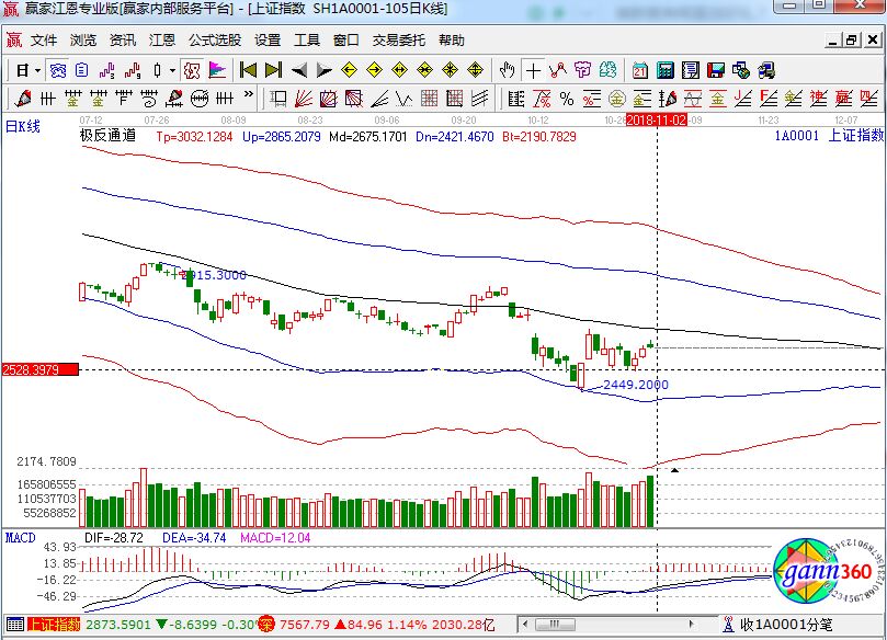 滬指漲0.13%,報收2606點;深成指漲1.14%,報收7567點;創(chuàng)業(yè)板漲0.84%,報收1286點。從盤面上看,人工智能、人臉識別、黃金、云計算、手游等板塊領漲;鋼鐵、銀行、煤炭、ST板塊、石墨電極等板塊領跌。滬股通凈流入57億,深股通凈流入29億。相應的極反通道指標的支撐壓力提示,如下圖所示: