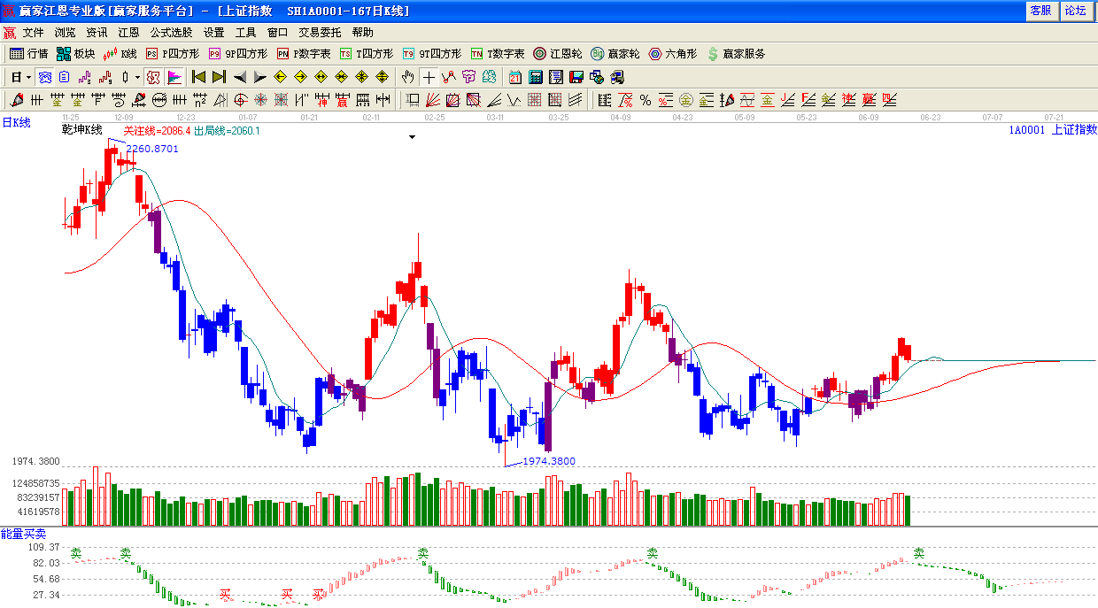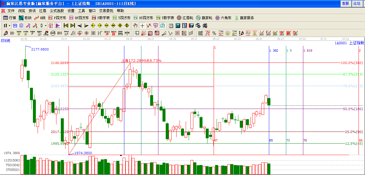 ☆依據(jù)贏家江恩系統(tǒng)黃金時(shí)間周期線提示:近期是16. 17日時(shí)間窗口,2060位置不破短期有望沖擊2100點(diǎn)。