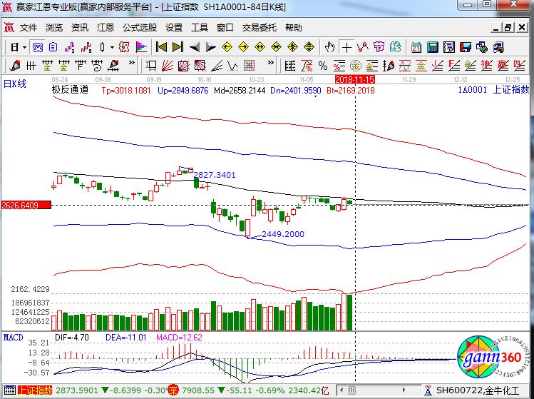 滬指跌0.85%,報收2632點;深成指跌0.69%,報收7908點;創(chuàng)業(yè)板跌0.45%,報收1385點。從盤面上看,電子發(fā)票、創(chuàng)投、自由貿(mào)易港、互聯(lián)網(wǎng)彩票、集成電路、芯片等板塊漲幅居前;可燃冰、石油、白酒、海工裝備、證券、ST板塊等板塊跌幅居前。滬股通凈流出4.5億,深股通凈流出1.9億。相應(yīng)的極反通道指標(biāo)的支撐壓力提示,如下圖所示: