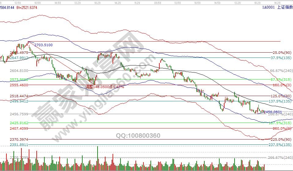 大盤日線失守黑色生命線震蕩下跌,按規(guī)則失守一線看低一線,調(diào)整空間看至藍(lán)色下軌線2400點附近,按歷史走勢規(guī)律當(dāng)K線下探此線確認(rèn)支撐后通常會有反彈出現(xiàn);空間點位上,江恩價格四方形顯示,3號大盤最低點同提示支撐2453僅相差2個點,4號盤中第一支撐繼續(xù)看135度2453點,第二支撐180度2421點,盤中反壓位是90度2484、2496點,激進(jìn)者可在支撐區(qū)間2453-2421開倉參與博弈,而穩(wěn)健者繼續(xù)等待江恩輪中輪提示的2391點和極反通道藍(lán)色下軌線2400點機(jī)會;時間窗口,下周一1月7日為日線時間窗。操作策略,穩(wěn)健者空倉繼續(xù)休息,等待藍(lán)色下軌參與機(jī)會,激進(jìn)者支撐不破3成倉短線快進(jìn)快出。