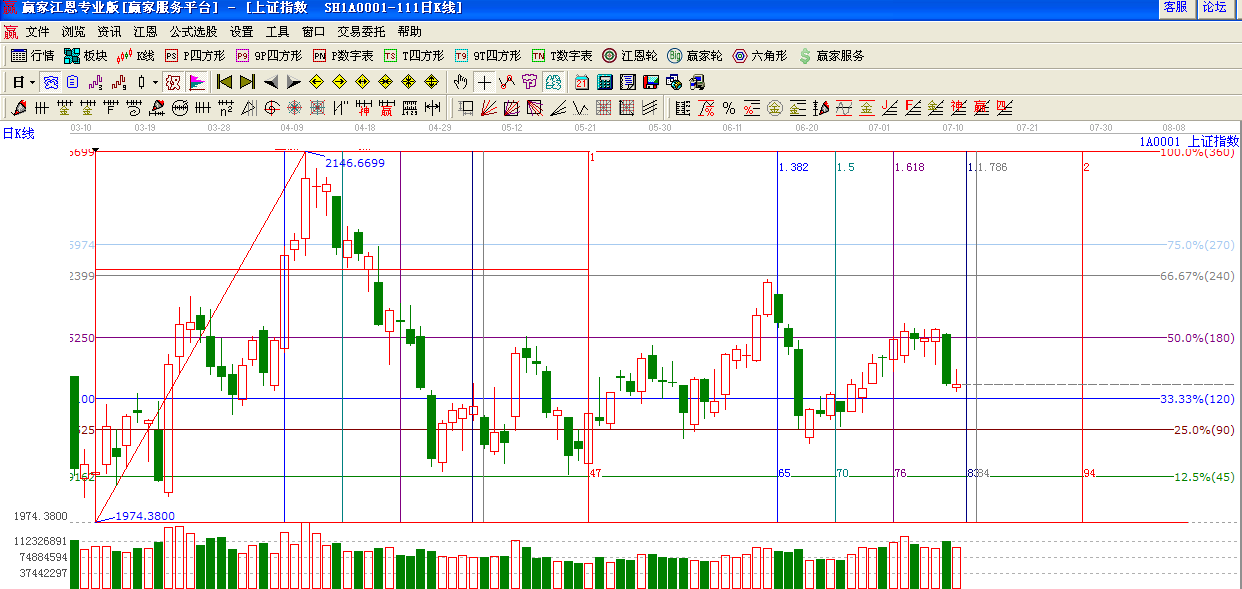 ★依據(jù)贏家江恩系統(tǒng)波段百分比提示:7月9號(hào)指數(shù)跌破江恩180度支撐,下方短線(xiàn)支撐120度度2031點(diǎn)。