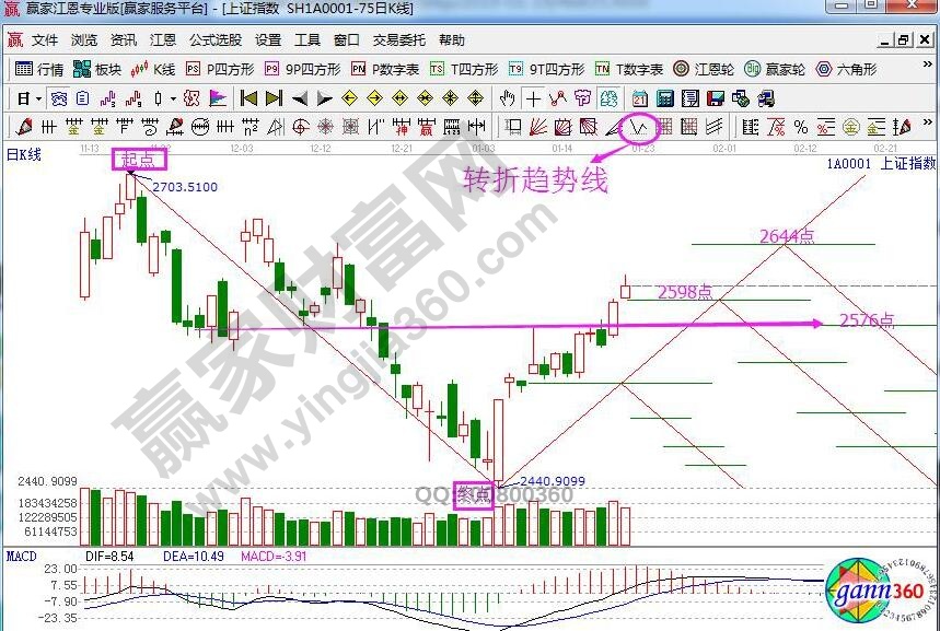 ★依據(jù)贏家江恩理論系統(tǒng)轉(zhuǎn)折趨勢(shì)線提示:以2703為起點(diǎn),2440為終點(diǎn)做轉(zhuǎn)折趨勢(shì)線,周一指數(shù)剛好高開在2598后獲得支撐震蕩走高。當(dāng)前2598為支撐,站穩(wěn)則看高壓力2644點(diǎn),失守則考驗(yàn)2576點(diǎn)。