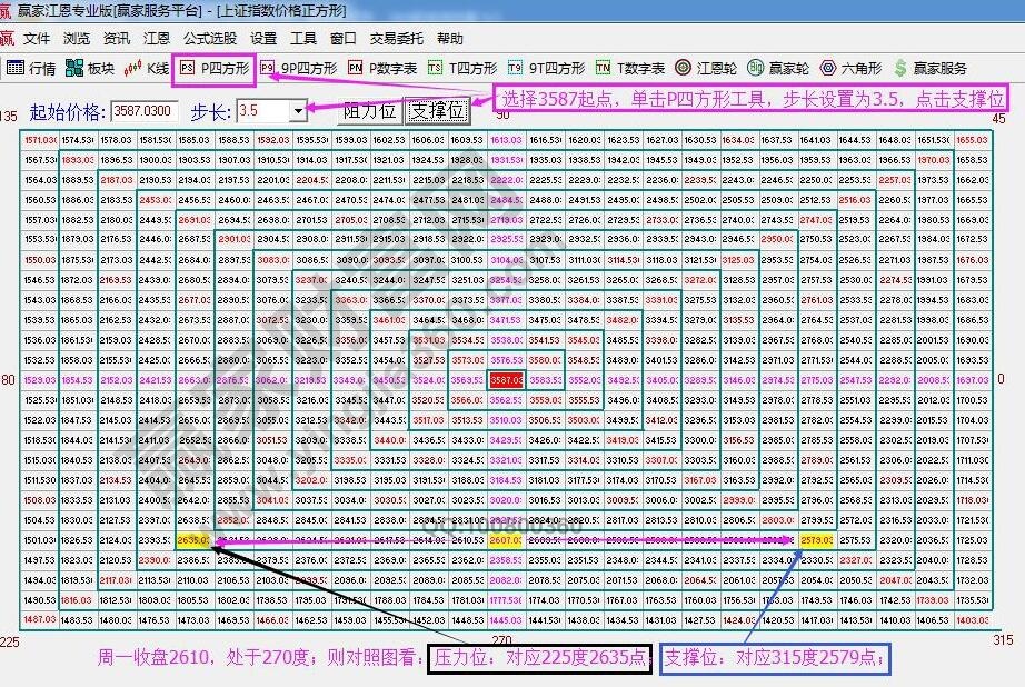 ★依據(jù)贏家江恩理論系統(tǒng)江恩價(jià)格四方形提示:以3587為起點(diǎn),做江恩價(jià)格四方形圖。周一收盤2610點(diǎn)處于270度位置,則,周二22日支撐位2579,壓力位2635。