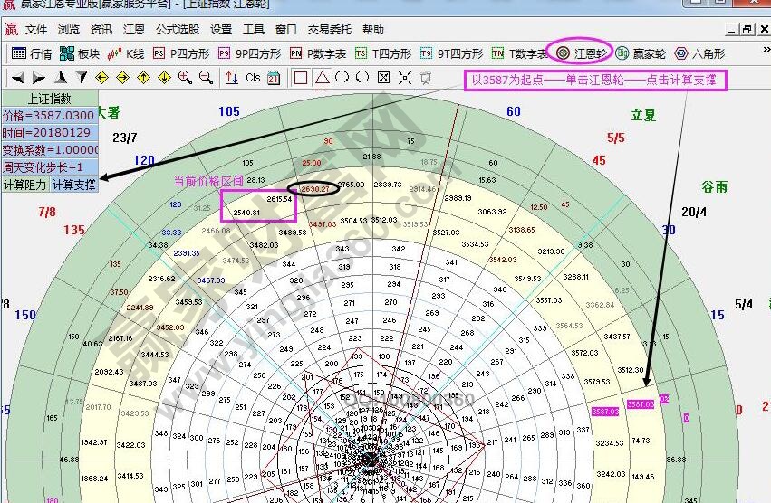 ☆依據(jù)贏家江恩理論系統(tǒng)江恩輪中輪提示:以3587為起點(diǎn),做江恩輪上輪時(shí)空分析圖??臻g上受阻2615壓力點(diǎn),突破則進(jìn)入下個(gè)角度2690;反則,將繼續(xù)確認(rèn)2540支撐。
