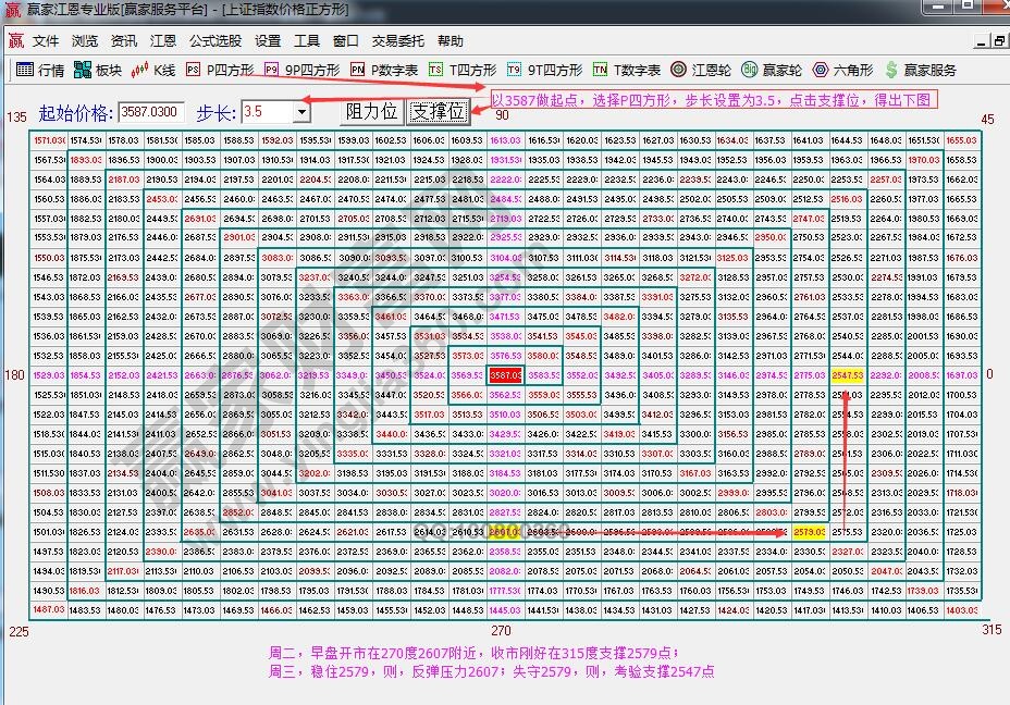 ☆依據(jù)贏家江恩理論系統(tǒng)江恩價格四方形提示:以3587為起點(diǎn),做江恩價格四方形圖。周二,指數(shù)早盤開在2609點(diǎn),剛好處于270度2607附近。全天震蕩走低,剛好收在315度2579點(diǎn)。周三,穩(wěn)住2579,反彈壓力看2607;失守2579,將考驗(yàn)支撐2547。