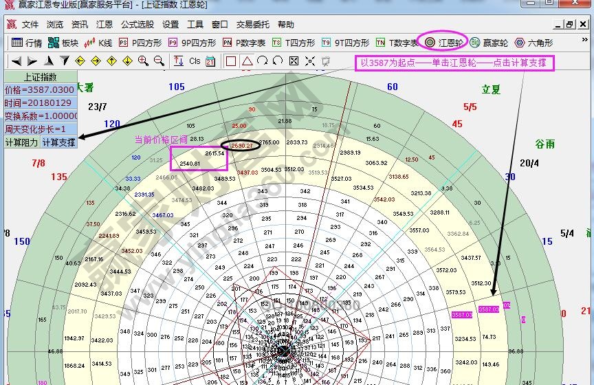 ☆依據(jù)贏家江恩理論系統(tǒng)江恩輪中輪提示:以3587為起點(diǎn),做江恩輪中輪時空分析圖。當(dāng)前受阻2615壓力點(diǎn)引發(fā)回落,空間上看將繼續(xù)確認(rèn)2540點(diǎn)支撐。