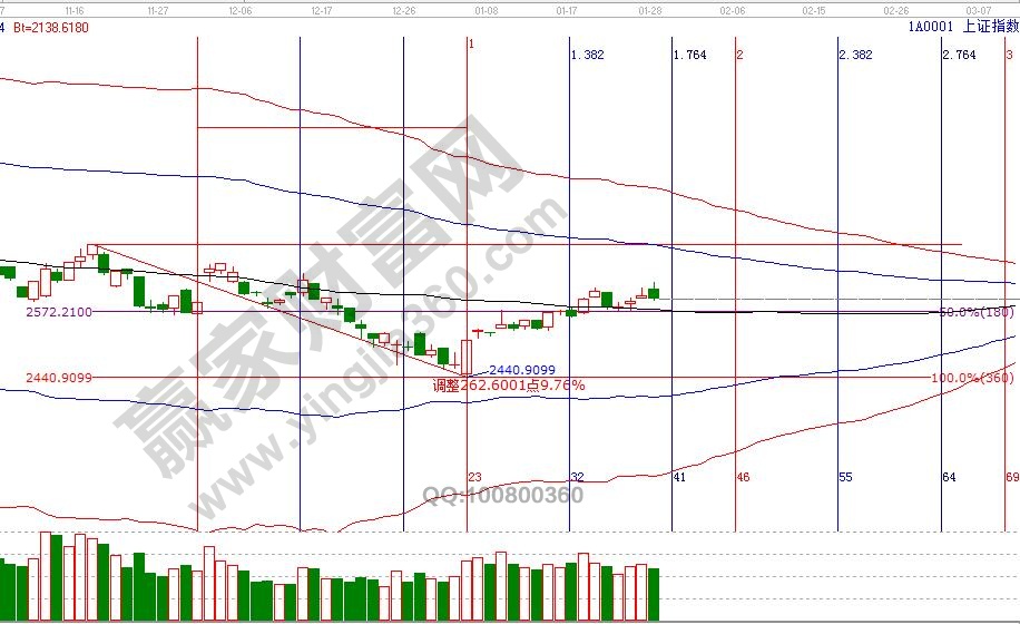 上周五分析中談到本周29號時間窗口,壓力2635點不能突破則短線將進入調(diào)整,市場將形成短線拐點,再度回探日線生命線2572點??臻g方面,波段百分比顯示,昨天高點2630與180度壓力2634點僅相差4個點,29號支撐是225度(2585點)、240度(2569點),29號是假期前最后一個時間窗口,下個時間窗是2月4號,因假期向后推遲。操作策略,大盤日線生命線上運行波段看多,這里是短線回調(diào),不改變波段上漲判斷,調(diào)整對于空倉者是一次建倉機會,對于高倉位者是一次調(diào)倉機會。